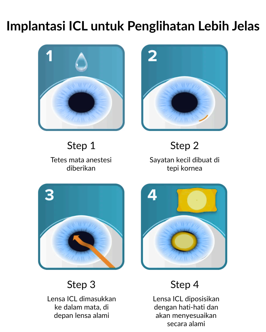 Selama prosedur, dokter akan membuat sayatan mikro kecil (sekitar 2–3 mm) pada kornea, lalu memasukkan lensa ICL dalam kondisi terlipat ke dalam mata. Setelah berada di dalam, lensa akan membuka perlahan dan diposisikan dengan hati-hati di antara iris dan lensa alami mata. Berbeda dengan banyak prosedur laser, ICL tidak mengangkat jaringan kornea, sehingga struktur alami kornea tetap terjaga dan pilihan terapi kornea di masa depan tetap terbuka bila suatu saat diperlukan.