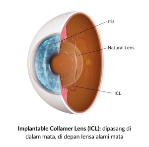 ICL adalah prosedur koreksi penglihatan di mana lensa yang tipis, fleksibel, dan biokompatibel ditanamkan di dalam mata. Lensa ini ditempatkan di belakang iris (bagian berwarna pada mata) dan di depan lensa alami mata. Fungsinya membantu sistem fokus alami mata sehingga penglihatan menjadi lebih jelas.