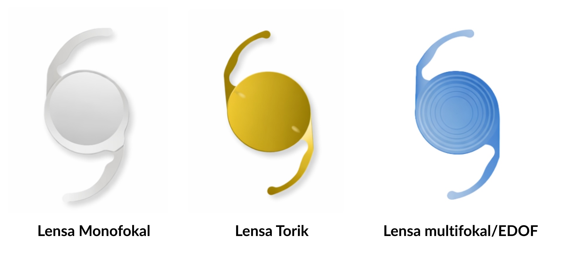 Memiliki rentang fokus paling luas, sehingga membantu penglihatan dekat, menengah, dan jauh melalui beberapa titik fokus dalam satu lensa. Jenis ini dapat sangat mengurangi ketergantungan pada kacamata dalam aktivitas sehari-hari. Namun, sebagian pasien dapat merasakan silau atau lingkaran cahaya (halo), terutama pada kondisi pencahayaan redup. Lensa multifokal umumnya dianjurkan pada mata yang sehat, tanpa glaukoma, kelainan makula, riwayat LASIK, atau mata kering. - Lensa EDOF (Extended Depth of Focus)