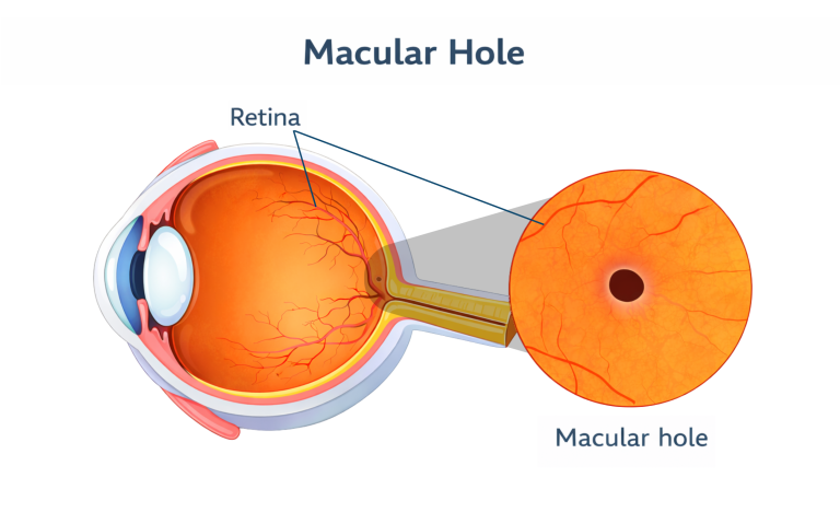 A macular hole is a small opening that forms in the macula, the central part of the retina responsible for sharp, detailed vision. It most commonly develops due to age-related changes when the vitreous gel inside the eye shrinks and pulls away from the retina. This traction creates a hole in the macula.